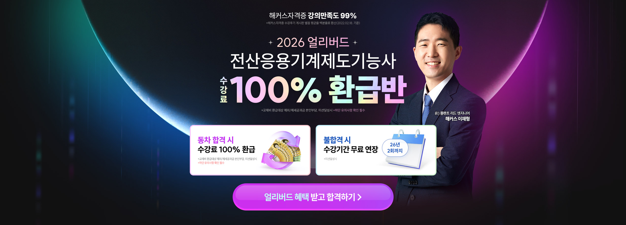 <100% 환급반>은 2026년 1회차 필기 또는 실기 시험에 응시 후 불합격 증빙자료를 제출 시 수강기간을 2026년 2회차 실기 시험일까지 연장해드립니다.