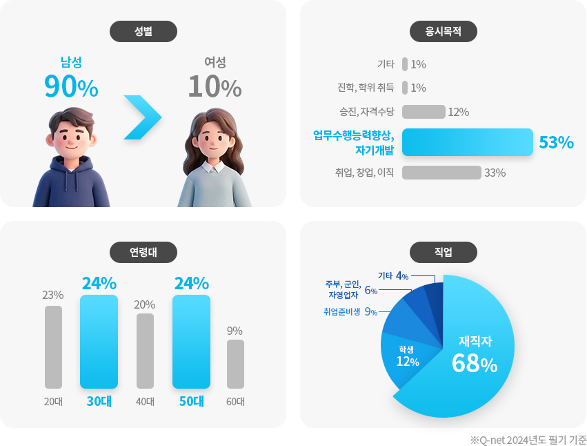 · 전체적인 학습범위는 다소 넓지만, 출제되는 범위가 한정적이기 때문에 전체 내용을 모두 이해하기보다는 주요 이론 및 키워드를 위주로 학습하는 것이 더욱 효과적입니다.